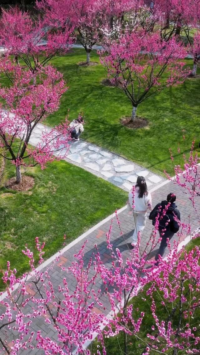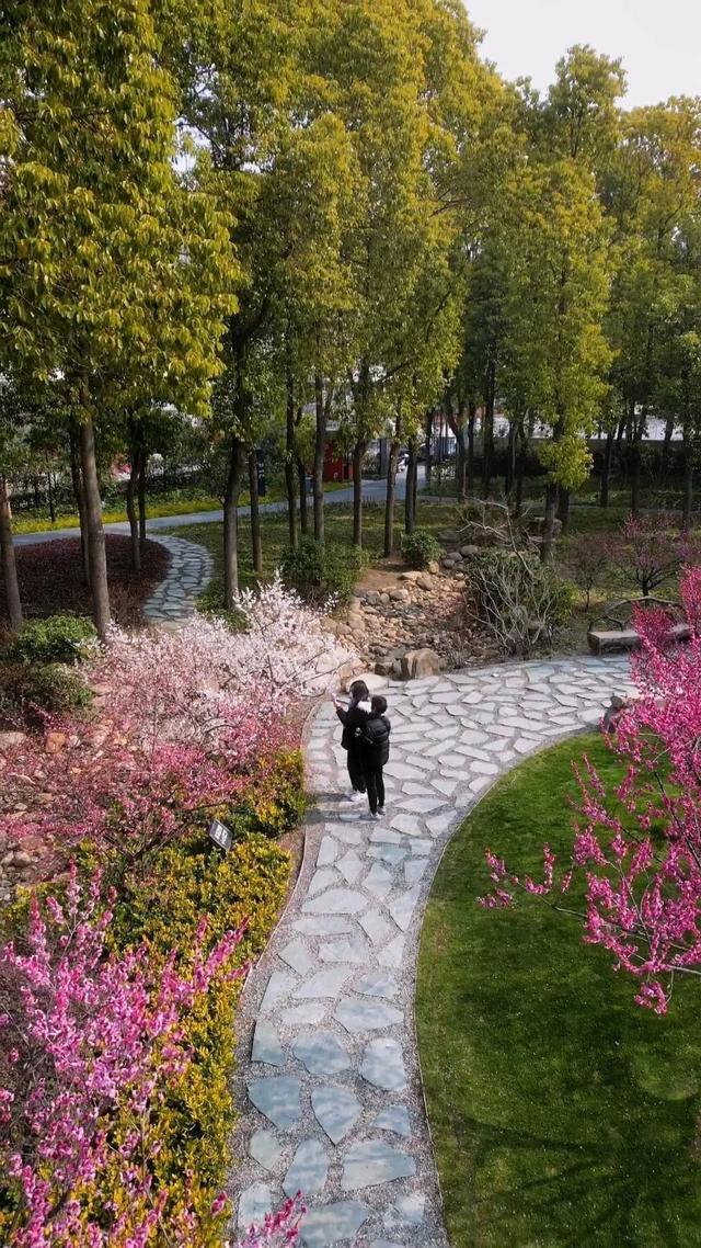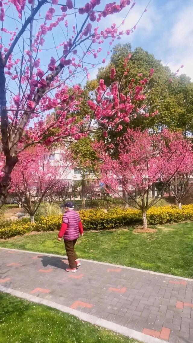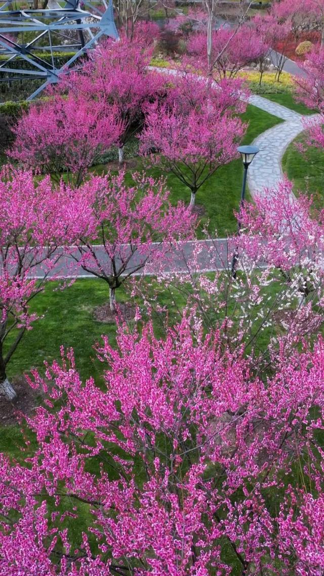 早春二月,正是踏青赏梅的好时节,在彭浦四季公园,各品种梅花纷纷进入盛花期。游客们在赏花时,常常驻足于树下,抬头细数梅花朵朵。而当视角变换,从高处俯瞰时,一株株梅花树连绵一片,恰如嫣红的云朵神游碧绿天。