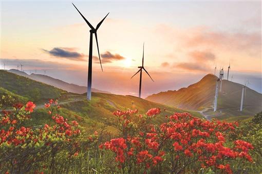 4月26日,江永县源口瑶族乡湖南省燕子山国家草原自然公园,漫山遍野的杜鹃花竞相绽放,与朝霞、云海、风力发电机组相互衬映,构成了一幅美丽的生态画卷。