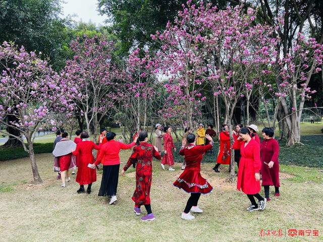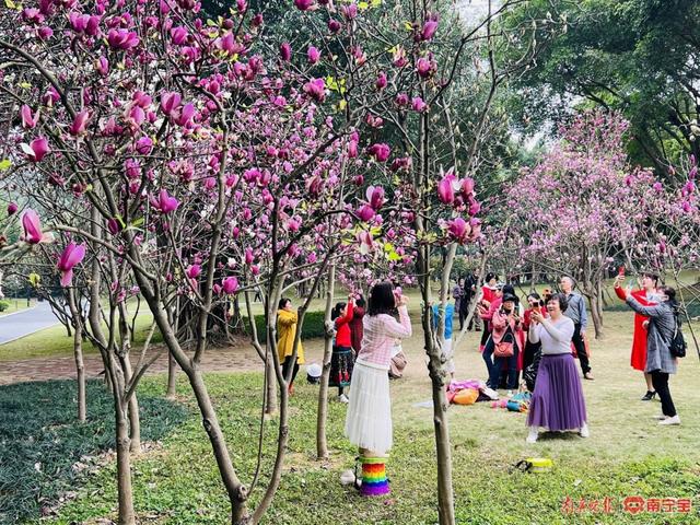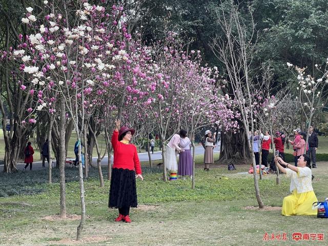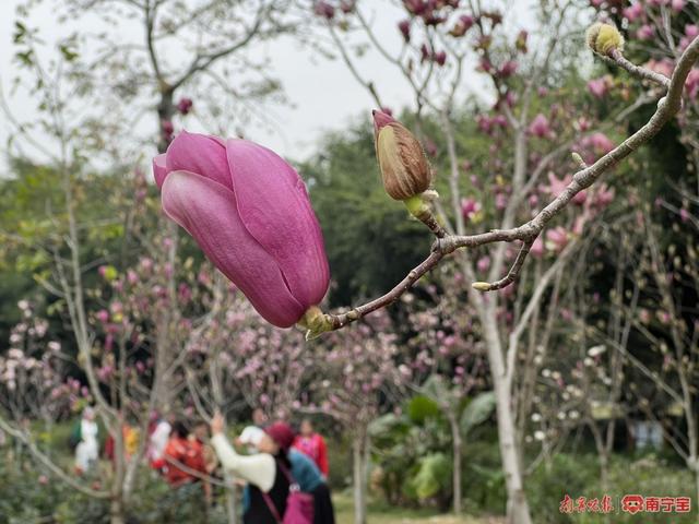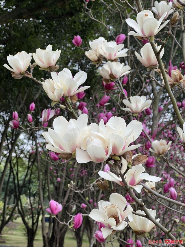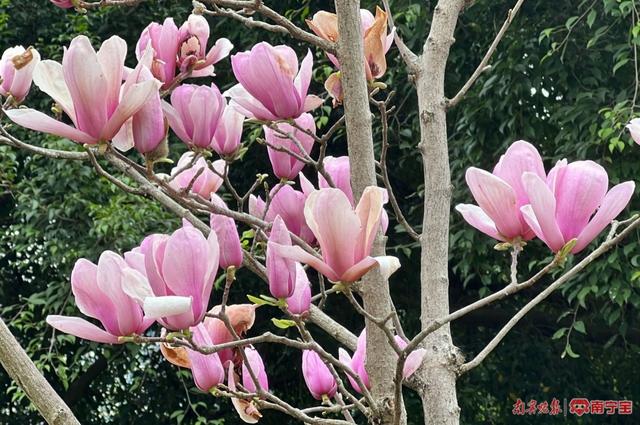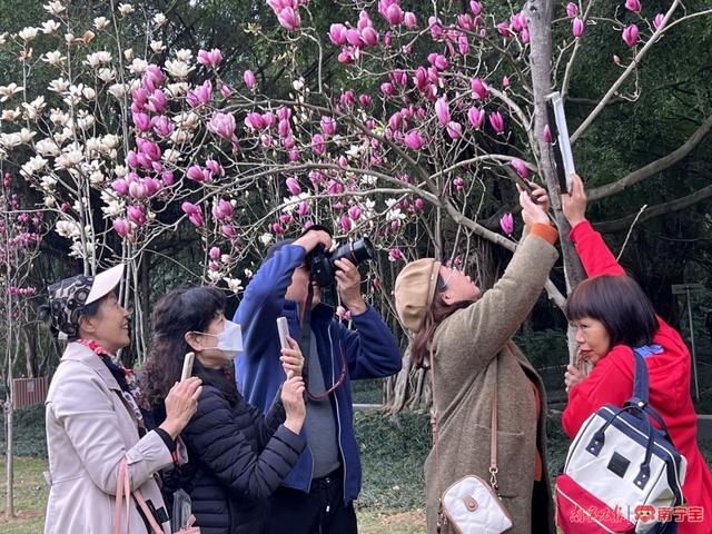 在南湖公园的大树盆景园东西两侧209株玉兰和二乔玉兰,如今正吐露芬芳,相继绽放,吸引了不少市民游客前来观赏。