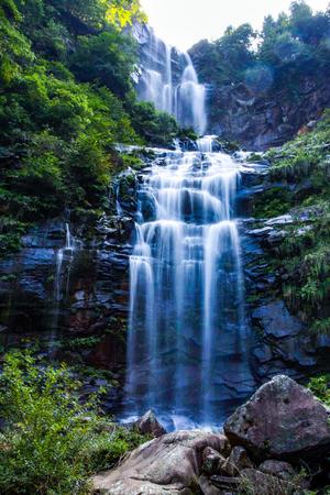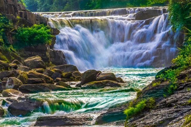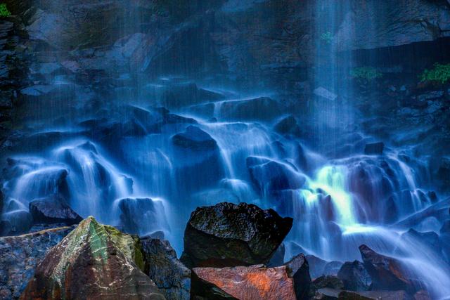 但,它己没有退路,唯有向前,唯有义无反顾,哪怕粉身碎骨,也要开出悲壮的花,映出五彩的虹,形成壮观的瀑布!就这样,一级,两级,三级,每一次都没有半点犹豫,没有丝毫恐惧,纵身一跃,于是生命在涅槃中精彩绽放,绝世美景——高洞岩瀑布在深山峡谷惊艳而出,浩然天地,正气飞升,无数游人趋之若鹜,在峡谷底部虔诚仰慕!