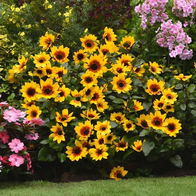 如果能买到对版的种子撒在地上,不用去管它天天有花看,一直能开到深秋季节,也是为了花园里不再杂草丛生,不妨养这些漂亮的太阳花,各种颜色整整齐齐地开放出来也是非常漂亮的。如果在阳台上想养太阳花,要经常地修剪打理,让它保持植株的整齐,开起花来才会一下开爆盆儿。