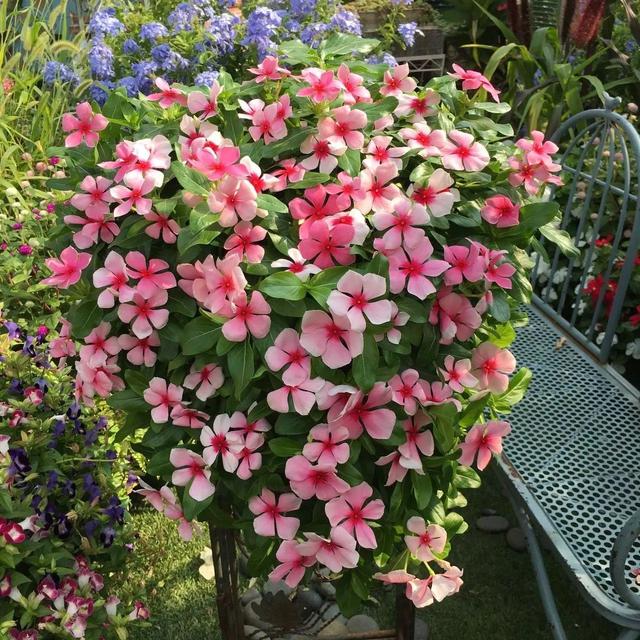 现在有很多园艺品种,有些垂吊的长春花也有很多矮生的长春花,各种花色的都有。在阳台上盆栽也是非常不错的选择,如果养护得好光照充足,能开成爆炸式的大花球。