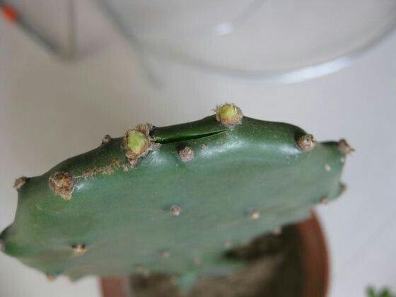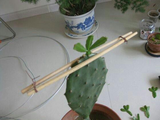 用酒精擦拭刀片进行消毒杀菌。然后在仙人掌顶端平切下一块,注意不能破坏刺髓部分,然后再在叶肉和表皮细胞形成层上深切一道口,再将蟹爪兰接穗两面削成尖状,插进仙人掌形成层内,两边用木夹子固定住即可。