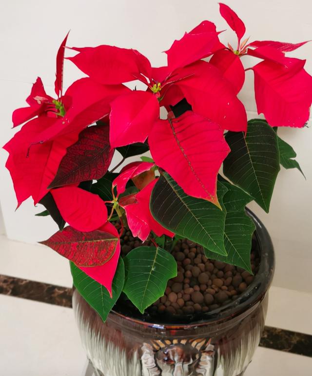 一品红它的叶片油绿,花开招摇,红彤彤的花萼在顶端红艳艳的开放,和绿色的叶片相互映衬,花红叶绿的感觉非常受人们喜爱。在欧洲一些地区,把它称作圣诞花,在过年过节时,经常用它来装点饰品,红彤彤的特别热烈而喜庆。