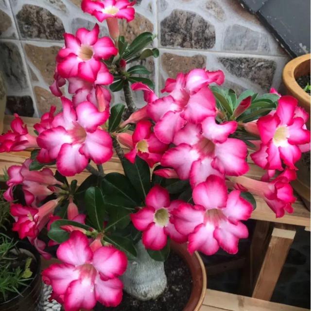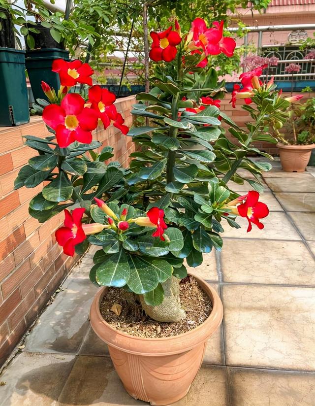 沙漠玫瑰是超级耐旱的植物,它有一个非常粗壮的茎,它的茎就像大肚子一样,储存满了水分和养分,它和仙人掌一样,属于热带的沙漠戈壁地区,那里干旱少雨,光照强烈,所以它们必须自己储存水分,供给自己生长,它和仙人掌一样耐旱,一样不怕暴晒,哪怕一个月不浇水也死不了,只是肚子稍微软了一些,浇透水之后很快就会缓过来,它需要强烈的光照才能够开花,和仙人掌一样的养法。