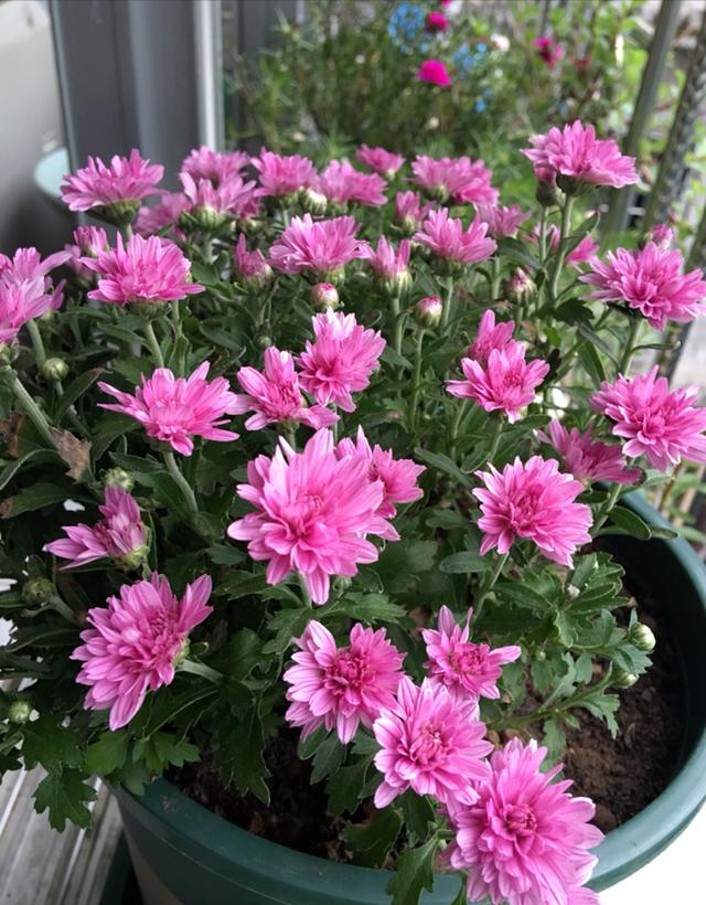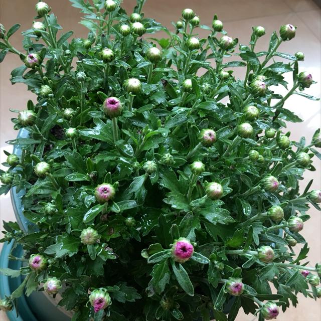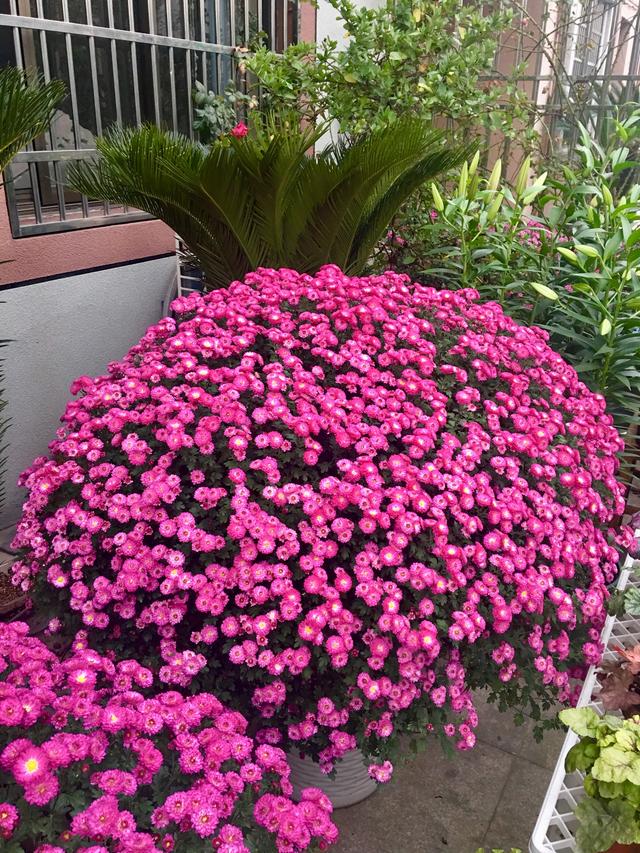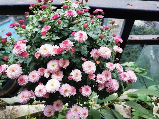 几乎不需要经常修剪打理,就可以长成球,整个株型显得特别的圆润饱满紧凑,非常容易开成爆盆的效果,球菊的开花能力特别的强,它的每一个顶端都是花苞密密匝匝的,看起来就特别喜庆,比较适合养在阳台上光照充足的地方,可以摆上几种花色的,因为球菊的花色品种特别多,养几个品种几种颜色的放在一起绝对惊艳。