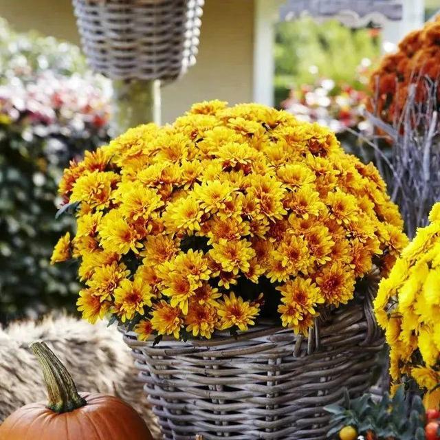 如果庭院有地方,也可以摆在庭院中两棵,甚至可以摆在门口两棵,花开成景,特别漂亮大气,它的花能持续两个多月的时间,到了深秋季节,甚至到了冬天,下雪天它还在依旧开花,它冬天能耐零下十几度的低温,在北方地区如果地栽的话,也可以持续过冬,但是温度太低了,要采取一些保温措施,毕竟在秋天里开花是消耗它的养分太大了,植株有点弱,一定要好好地保护,到第二年暖和的时候就发芽,第二年还能再开花。在秋天我们可以买一些菊花的小苗,因为小苗也会开花的,只不过是花球的数量比较小而已。