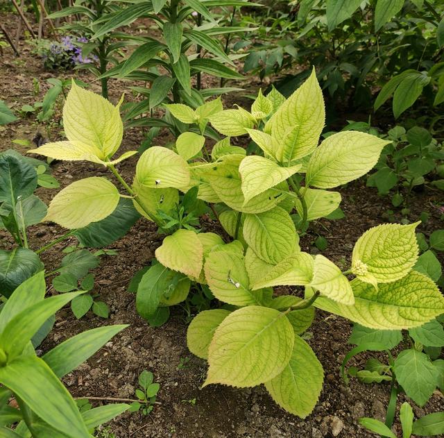 绣球花是近年来特别流行的网红植物。绣球花因为生长过快,对土壤养分的消耗量比较大,对酸性物质的消耗量也比较大。如果土壤中的酸性物质已经被消耗殆尽,吸收不了充足的铁元素,它的叶片就会逐渐出现叶脉发绿,叶片发黄的状态,这就是典型的缺铁性黄叶,