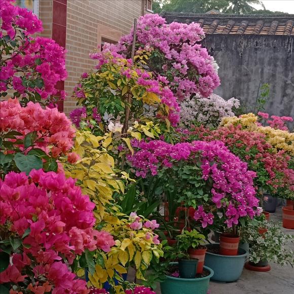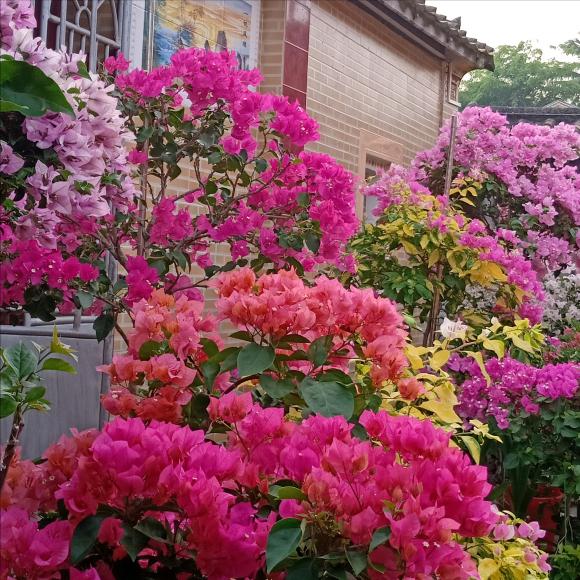 方能花开满盆,花团锦簇。三角梅的养护在夏天要扔在外面使劲晒,光照越充足,开花就越多,任何品种的三角梅,在炎热的季节都会花开爆棚,可以多养上几个品种摆在阳台、室外或者庭院中,在南方地区一年不管它,甚至能开成花树,能爬到一二十米高呢,不过在北方地区,冬天就要拿到室内保温了。