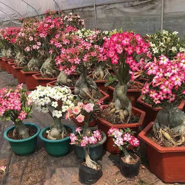 听名字就特别的耐旱,就像沙漠中的玫瑰一样,其实它也叫天宝花,是妥妥的懒人植物。 它是特别耐晒的,夏天高温季节在外面暴晒也没关系,越晒太阳越开花,它粗壮的根茎里储存了水分和养分,干透了再浇水,浇水时兑点磷酸二氢钾,可以从五月份一直开到十一二月份。沙漠玫瑰的花朵就像小喇叭,而且花色很多,有单瓣的,有重瓣的,因为耐旱爱开花,所以越来越受到人们的喜爱了。