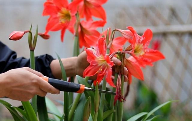 朱顶红适宜生长温度15度到25度,如果冬天室内温度合适,在过年刚好开花的,但是过完年后,朱顶红逐渐开败了,也要把它的花剑适当地修剪掉,修剪残花的时候,尽量保留着花茎,因为花茎又粗又壮又高,里面包含着一些养分,可以让养分回流,只修剪掉残花以及下面三四厘米左右枝条就可以了,让它的花箭的养分继续往下回流,养分可以供给种球的生长,给植株提供养分,等到花箭干了之后,直接抽出来就可以了,这也是修剪朱顶红的一个技巧。