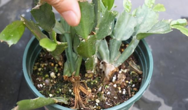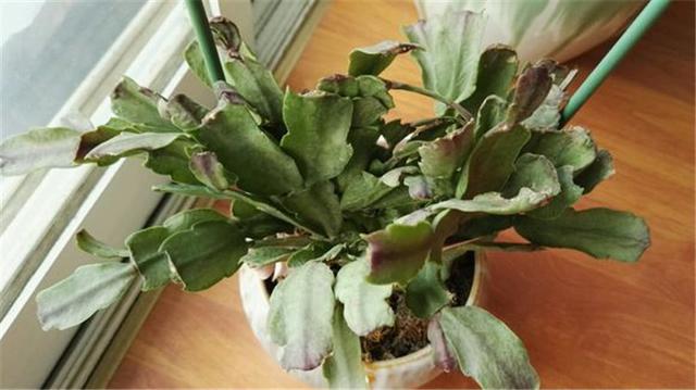 很多人养得的蟹爪兰叶片出现叶片干瘪,浇水之后也不能够缓解的问题。其实,这样的蟹爪兰如果你浇透水,还不能让叶片吸收让叶片硬挺起来,就是蟹爪兰烂根所导致的。蟹爪兰的根系本身就不发达,是很细的一些毛细根,特别的怕积水烂根。养蟹爪兰不能用大花盆,要用小花盆。盆土干了再去浇水,掌握好浇水也是比较好养的。如果烂根了,叶片严重缺水就会打蔫,试着拔一拔蟹爪兰的根系,一般烂根了,它的盆土表面会出现明显的松动,如果松动了烂根了,及时地剪掉叶片,剪掉烂根,再重新扦插。