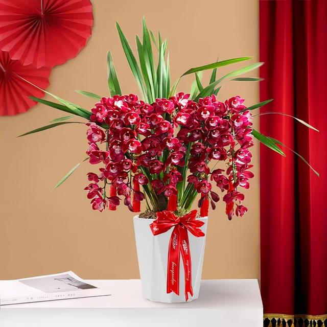 大花蕙兰也是过年时很多人喜欢的年宵花卉。大花蕙兰花大又霸气,植株高大,开花雍容华丽,花朵娇嫩无比,富丽堂皇,比较适合放在客厅中,特别显眼。而且寓意还特别好。大花蕙兰也被称作是一次性的花卉,过年之后有很多人会把开败的大花蕙兰直接丢掉,因为它的复花性比较差,而且当年的老苗不会再开花,如果想再开花,要从底下分生出小的苗,小苗要生长一两年的时间才可以,中间如果稍微养护不当,容易出现不复花以及养的黄叶烂根的情况。