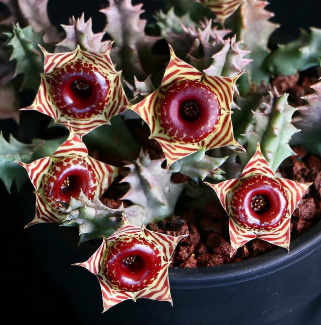 这种植物是花卉市场上比较少见的一个品种,在它不开花的时候,形态长得就好像bet365365体育 一样。但它开花以后看上去颜值是完全不一样的,它的花朵长得就像一个甜甜圈一样,又像一个大海星,看起来非常的美观奇特。如果第一次看到这种花的话,甚至会误以为它是假花艺术品。
