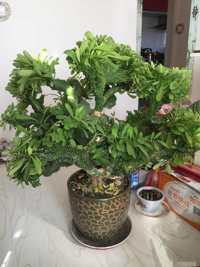 龙骨是一种可以长得十分高大的植物,它的主干包括它的分枝都会不断的向上生长,可以长到两三米高,很多花友养的龙骨,顶到屋顶,非常霸气。它的叶片形态类似于仙人掌,表面是带有尖刺的,呈现菱形。在刚开始养护的时候,可能觉得它并不是太美观,但我们养护时间长一点的话,就会发现它的植株看上去是十分霸气的,整体看上去就好像一棵小树一样。