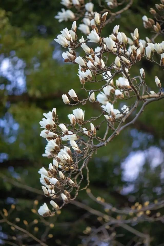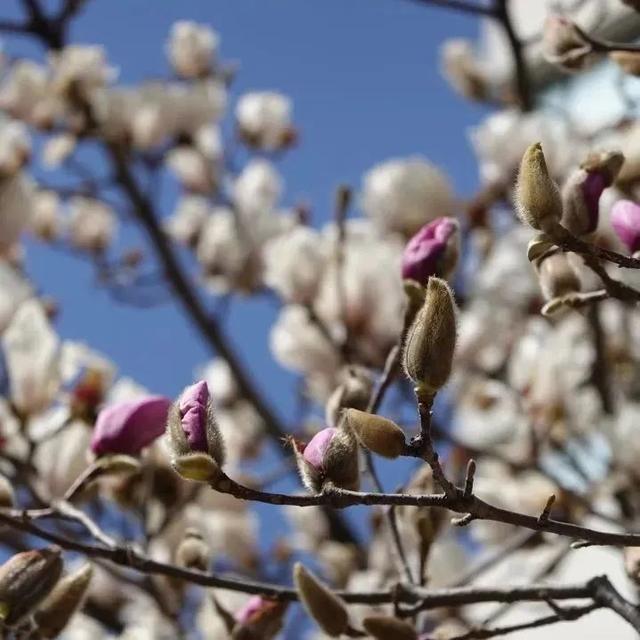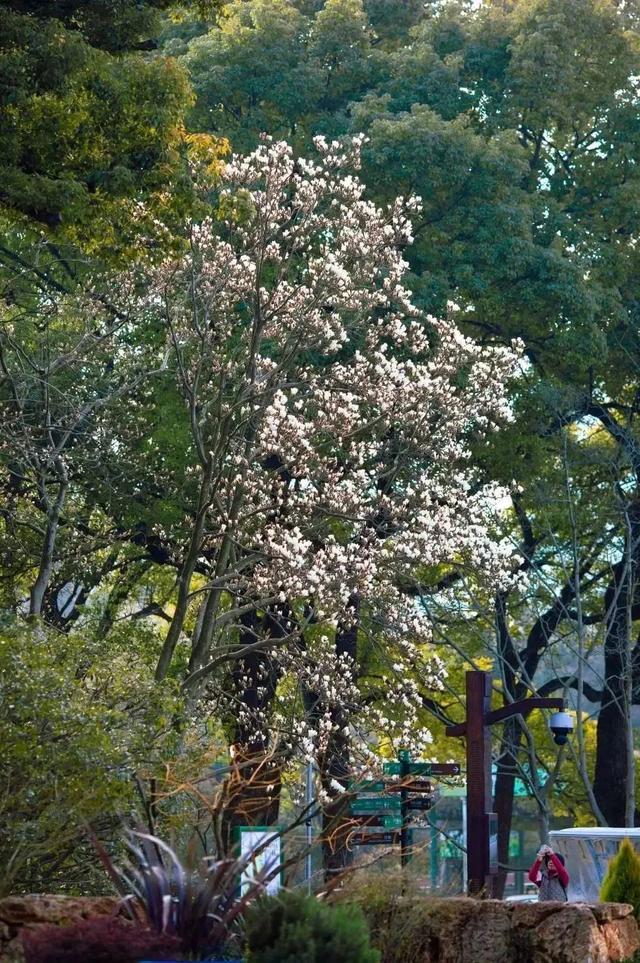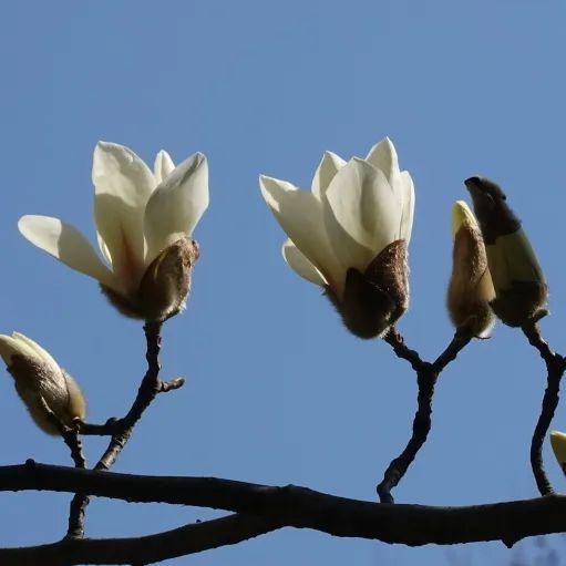 徐汇公园绿地的玉兰花有的迎春盛放,令人陶醉于“素娥千队雪成围”的盛装素裹;有的含苞待放,但得闻“冷魂未放清香浅”的初绽,便已甚感快慰。在绿叶落尽的枝干上,花儿被衬托得比雪花更圣洁,比白云更飘渺,仿若庄重典雅的仙子,遗世而独立。