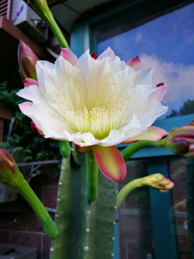 不过这棵龙骨开出的花量也是巨大的,从下到6楼,十几米高,依次都开满了花了,这个量天尺,光是看着它的植株就已经觉得非常震撼了,有一种直通云霄的感觉。据种植者刘先生所说,这棵量天尺是近几年才开始开花的,之前的十几年一直都没有开过花朵。可见把量天尺养到开花也是需要很长时间的。