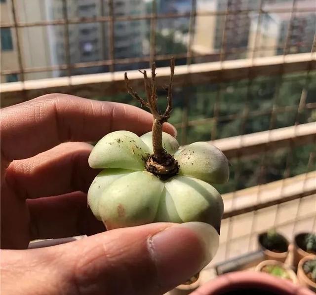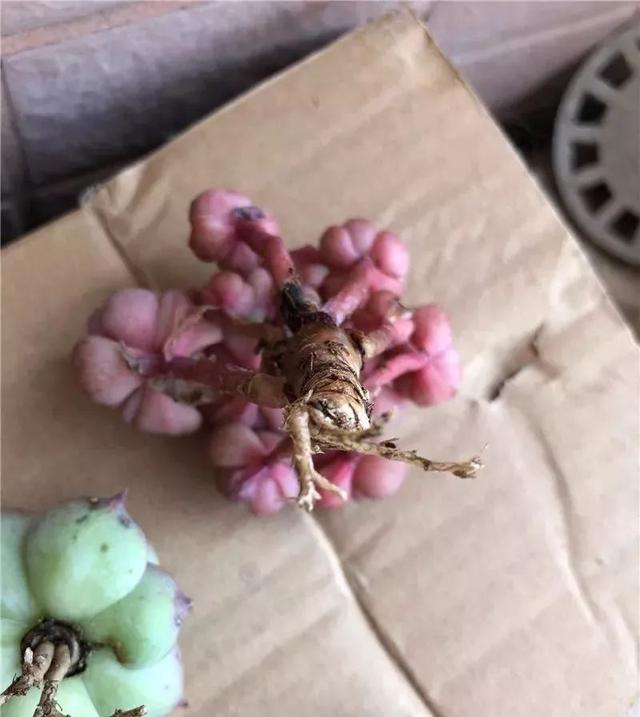晾根就是让多肉的根部晾在空气里,像图上的多肉根部,晾上1-2天之后再上盆,这能够加快它服盆,晾根要注意的事情也不多,基本就两点:不能暴晒,不能朝它喷水。至于选盆和配土,盆可以用红陶盆,土可以用一半细土一半颗粒这个配方,铺面的颗粒有很多选择,看您身边有什么就用什么吧。