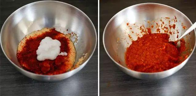 3.制作酱料:加入糖、蒜末、辣椒粉、虾酱、葱拌匀。