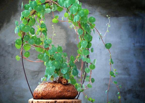 山乌龟,它既能够赏叶子,也能够赏球茎,可以用一个非常古朴的花盆儿埋住种球儿的1/5就可以,余下的部分可以裸露在外面。它的茎杆古朴而斑驳,非常的像盆栽盆景的造型,而且又长出油绿的小叶子。观赏性能非常强,浇水也不要多浇,盆土干透了再浇,这种块根的植物能积蓄很多的水分和养分,但是最好在花盆中撒一些缓释型的肥料,