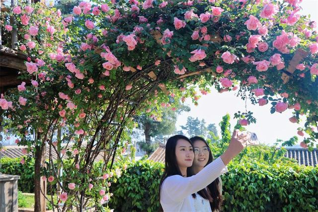 站在花朵缠绕而成的花门下,梦幻气息扑面而来,伴着花香拍下一张照片,甚是美丽。