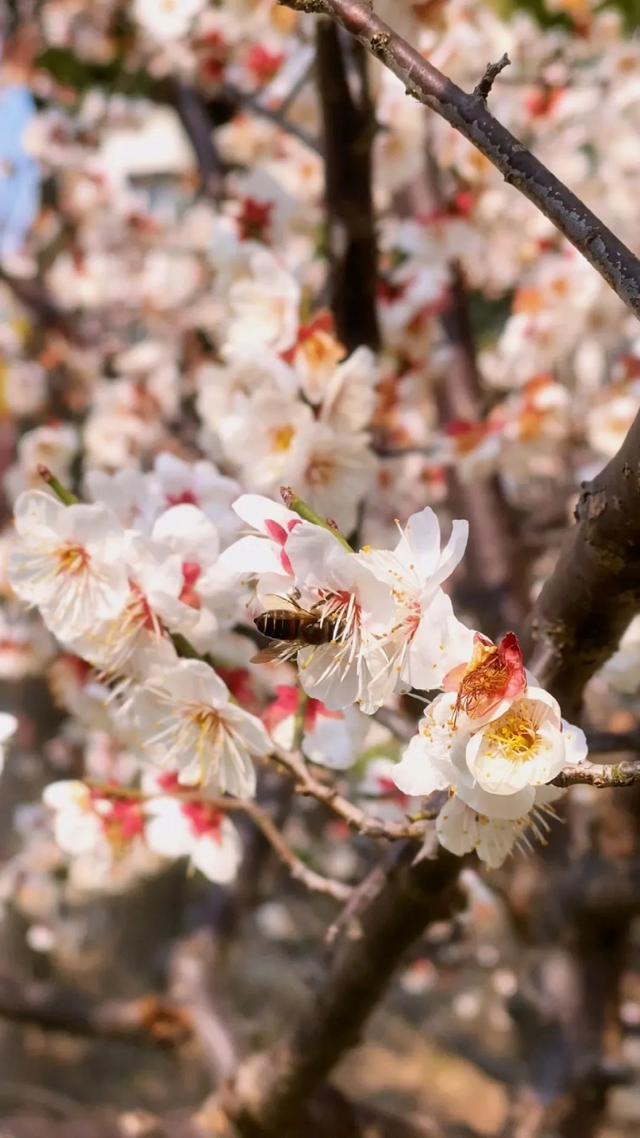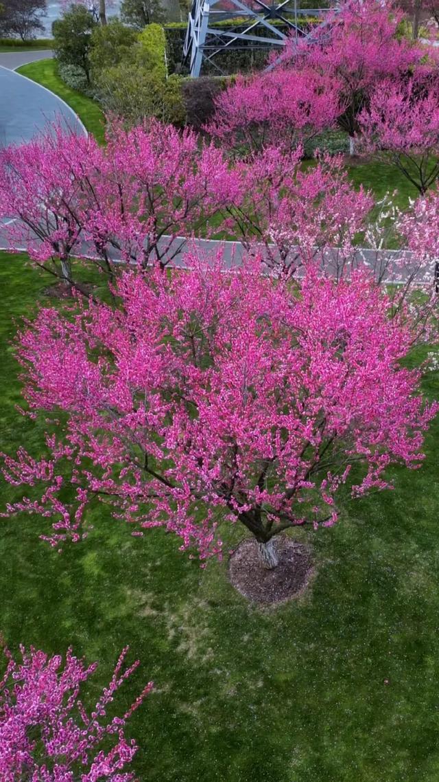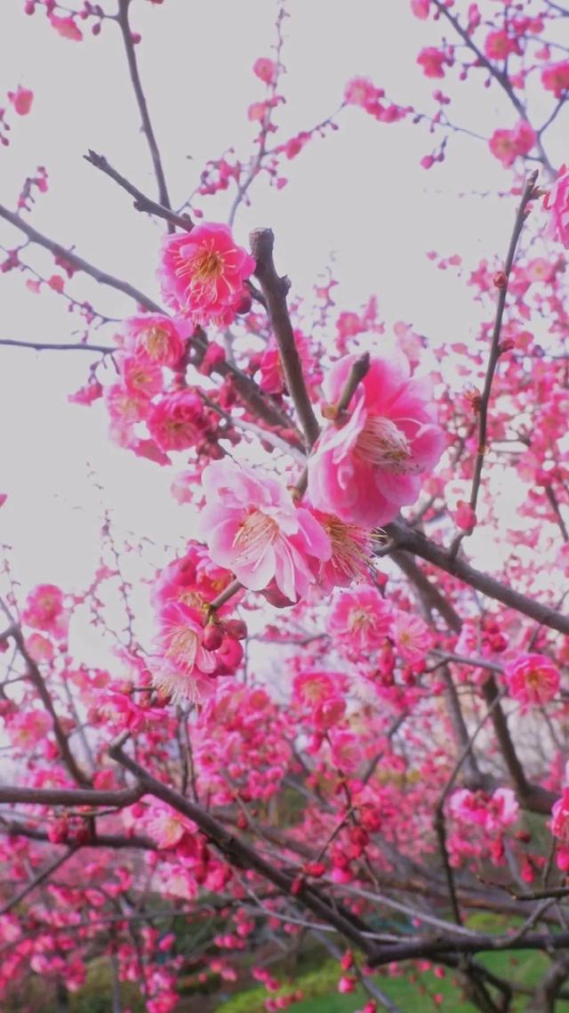 早春二月,正是踏青赏梅的好时节,在彭浦四季公园,各品种梅花纷纷进入盛花期。游客们在赏花时,常常驻足于树下,抬头细数梅花朵朵。而当视角变换,从高处俯瞰时,一株株梅花树连绵一片,恰如嫣红的云朵神游碧绿天。