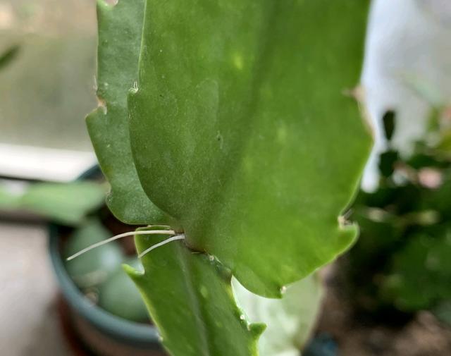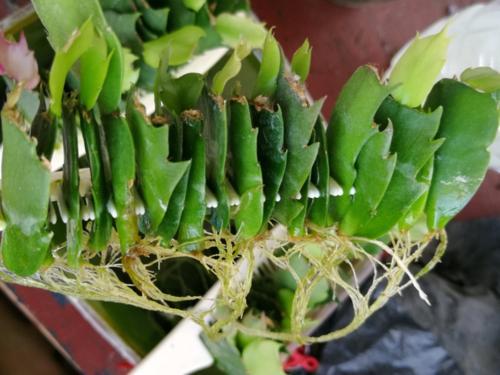 蟹爪兰在夏天非常炎热的季节,属于休眠半休眠的状态,但是周围空气湿度过大或者底部根系出现问题的时候,它就会从叶片中间出现气生根。这种气生根可以剪下来直接扦插在土里,因为长出的气生根,它也是可以吸收水分和养分的,扦插的时候把它放把它的叶片轻轻地剪下来,不要伤到气生根,然后扦插,再把它移栽在湿润的潮湿的土壤中,放在阴凉通风好的地方,然后等着它静静地生根生长就可以了,因为本身有气生根,不用再等着它慢慢的再去生根,所以,扦插速度以及成活率会提高很多。