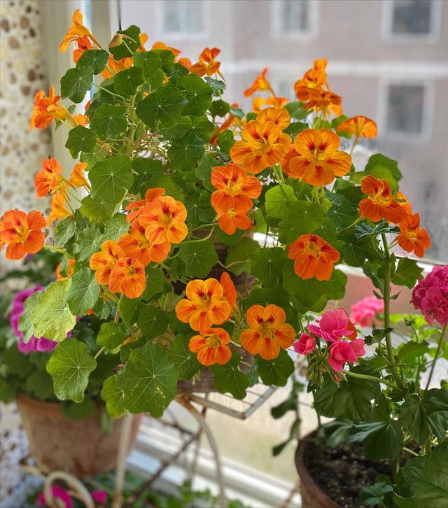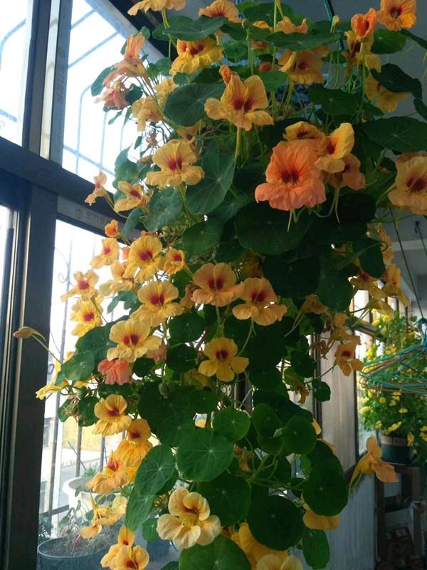 旱金莲也是非常喜欢冷凉型的花卉,旱金莲开花就像一朵朵的小莲花,但是它的叶子就像一个个的小荷叶,碧绿呆萌,精致可爱,就像圆滚滚的铜钱一样。旱金莲生长泼辣,可以攀爬,也可以垂吊下来,花开量非常大,最常见的是娇艳的橘红色,