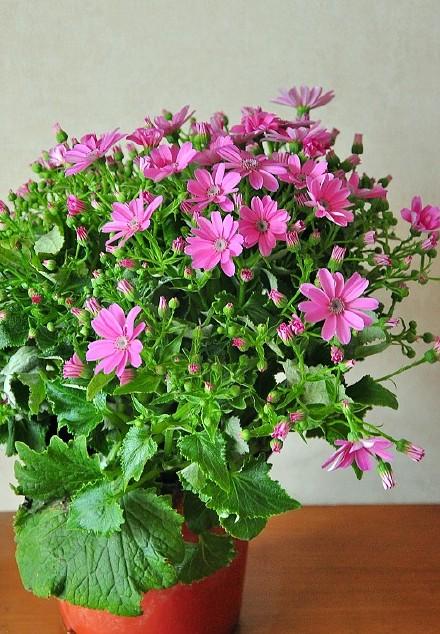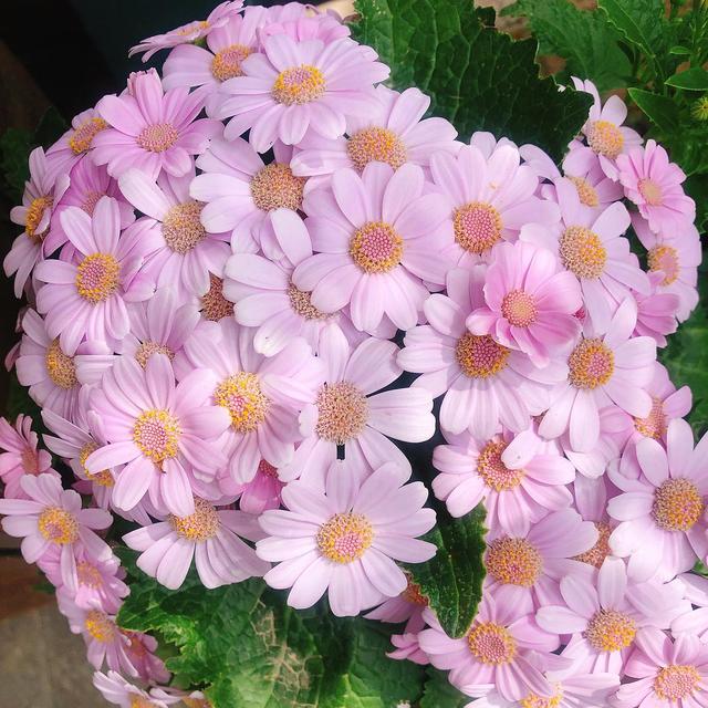 瓜叶菊叶子就像某些瓜类的叶子,又薄又大,它开花非常鲜艳,清新可人,生机灵动,一茬花能持续一个月左右,经久不衰,十分漂亮,放在阳台上多晒晒太阳,可以一直能开到春天。瓜叶菊是一种小草花,但是它的花开量特别大,可以轻松开成花球的样子,