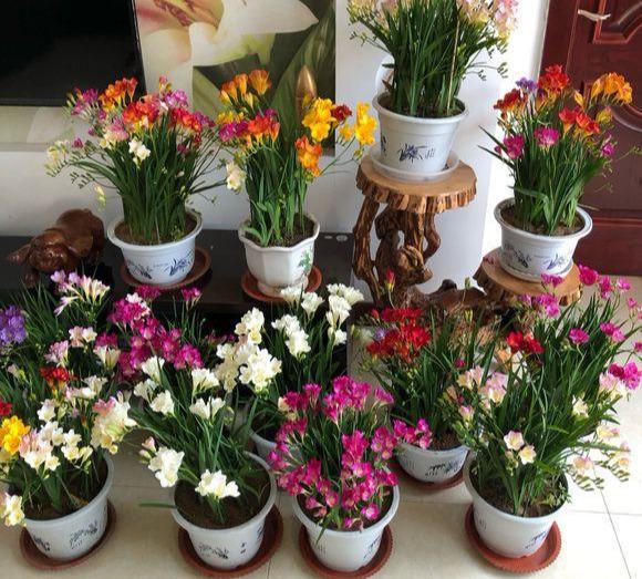 香雪兰它的花色品种特别多,各种颜色的交织在一起,开起花来五颜六色,花枝招展,花色烂漫,清香扑鼻,任谁看了都喜欢。种一次就能收获两倍的种球,第二年种下去就变成了大户,有香雪兰的发烧友,在家里种了十几盆香雪兰。开花时节,满屋子的清香气,别提多浓郁了,花枝招展,五彩阿缤纷就像天上的鲜花一般,怎么看也看不够。所以如果家里光照充足,可以养几盆,肯定不会后悔的哦。