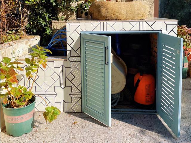 在洗手池的校门上,她采用的是铝合金材料的百叶造型,可以久经日晒不变色。再安装了一个黑把手,瞬间有一种北欧风情,而且还可以将喷药、浇花的装备还有肥料等各种杂物摆在里面,既能做洗手池,又能做储物房,还能节省很多空间。