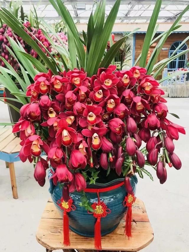 大花蕙兰也是过年时很多人喜欢的年宵花卉。大花蕙兰花大又霸气,植株高大,开花雍容华丽,花朵娇嫩无比,富丽堂皇,比较适合放在客厅中,特别显眼。而且寓意还特别好。大花蕙兰也被称作是一次性的花卉,过年之后有很多人会把开败的大花蕙兰直接丢掉,因为它的复花性比较差,而且当年的老苗不会再开花,如果想再开花,要从底下分生出小的苗,小苗要生长一两年的时间才可以,中间如果稍微养护不当,容易出现不复花以及养的黄叶烂根的情况。