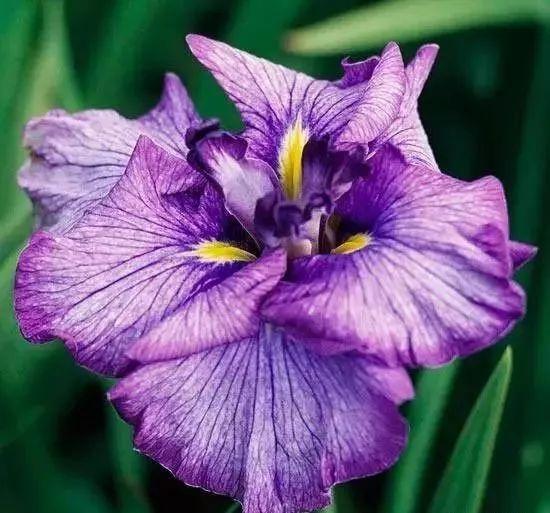 花菖蒲玉蝉花的变种。多年生宿根挺水型水生花卉。花葶直立并伴有退化叶1-3枚。花大直径可达15厘米。外轮三片花瓣呈椭圆形至倒卵形,中部有黄斑和紫纹,立瓣狭倒披针形。花柱分枝三条,花瓣状,顶端二裂。蒴果长圆形,有棱,种皮褐黑色。花期6-7月,果期8-9月。以日本栽培最盛,己育出一百多个品种。花菖蒲耐寒,喜水湿,春季萌发较早,花期通常在早春至初夏,冬季进入休眠状态,地上茎叶枯死。喜欢富含腐殖质的酸性土壤,忌石灰质土壤。