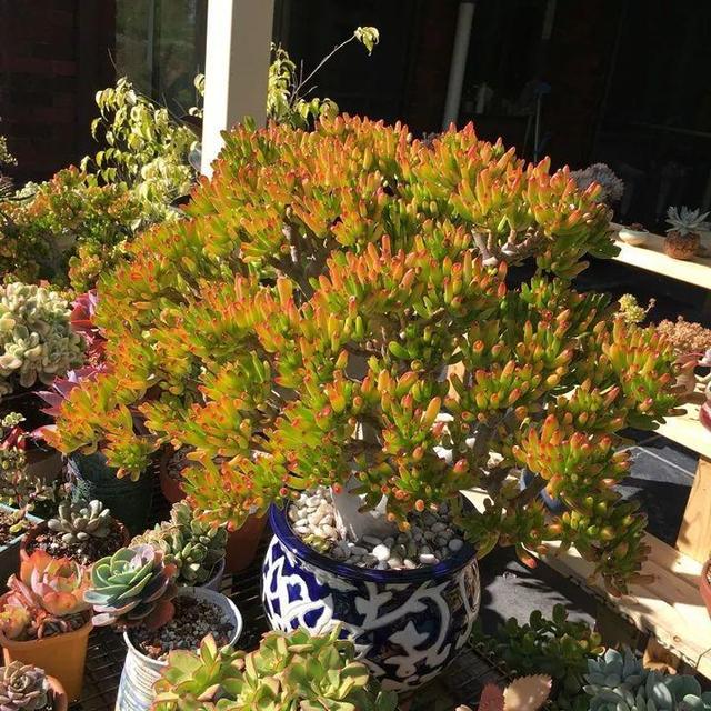 而它的叶片颜色也是非常神奇的,当我们在室内养护的情况下,它的叶片是呈现绿色的,而我们将它转移到阳光较好的地方以后,就会发现它叶片的顶端会呈现出橘红的颜色。非常漂亮,呈现金碧辉煌的状态,养护吸财树也是比较简单,它喜欢冷凉的季节,在春天,秋天生长的较快,颜色也最鲜艳,