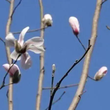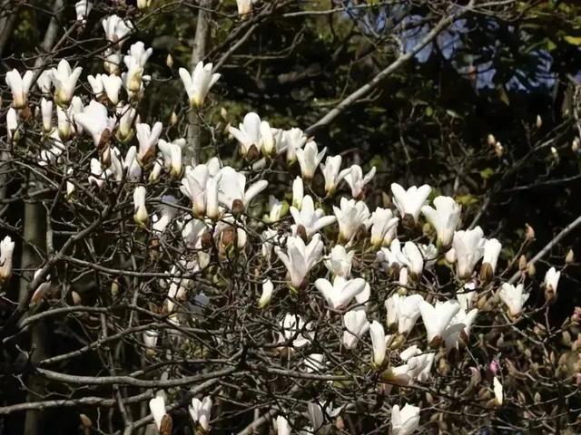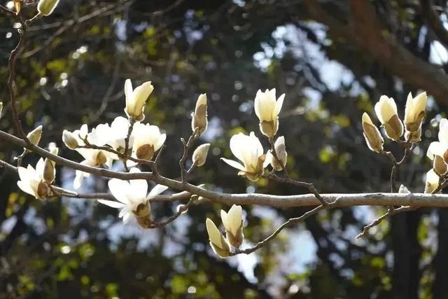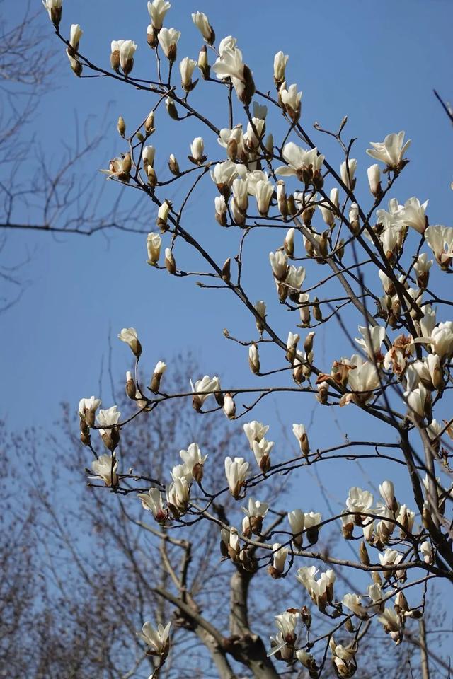徐汇公园绿地的玉兰花有的迎春盛放,令人陶醉于“素娥千队雪成围”的盛装素裹;有的含苞待放,但得闻“冷魂未放清香浅”的初绽,便已甚感快慰。在绿叶落尽的枝干上,花儿被衬托得比雪花更圣洁,比白云更飘渺,仿若庄重典雅的仙子,遗世而独立。